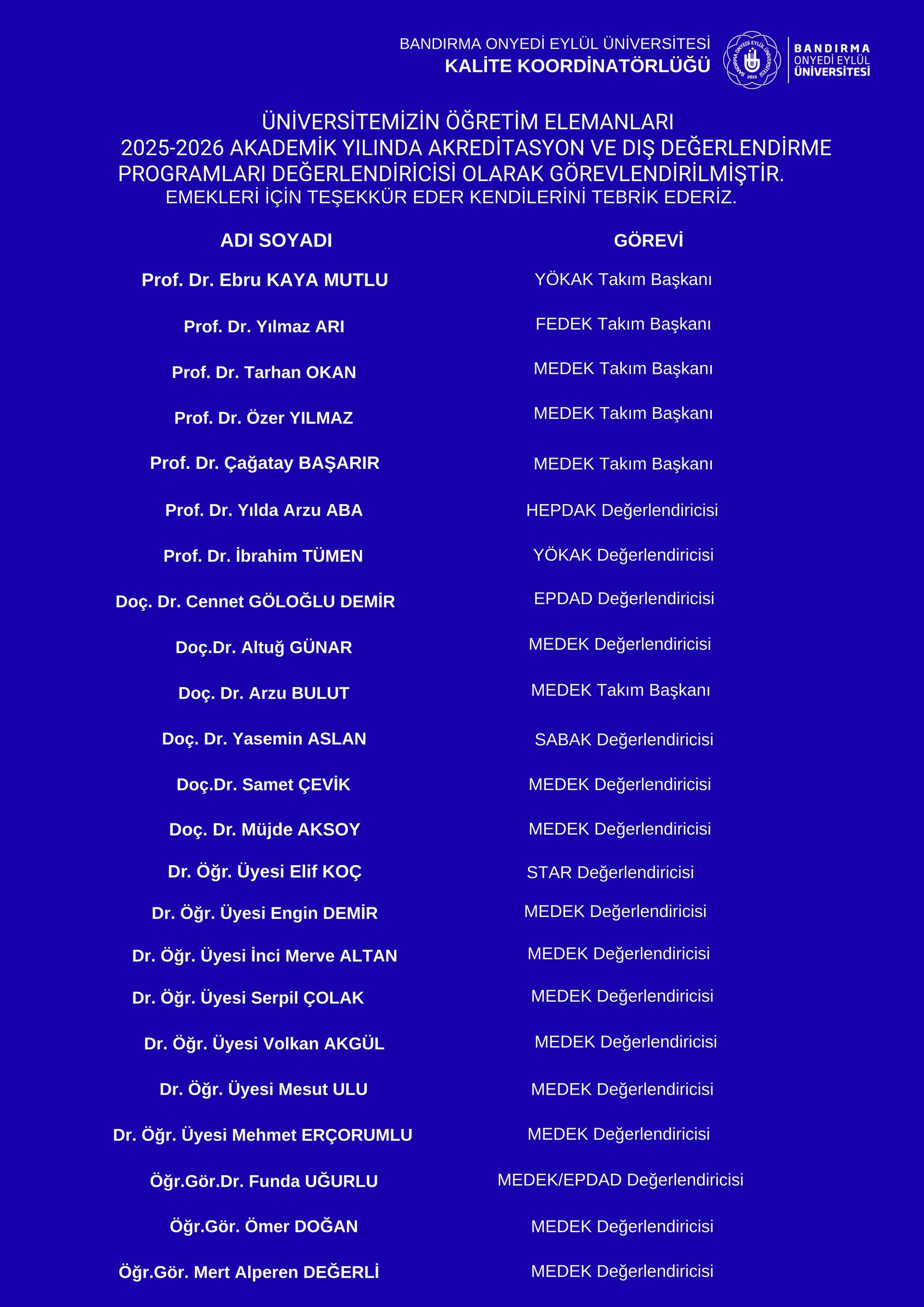 2025 Yılında Akreditasyon ve Dış Değerlendirme Programı Değerlendiricisi Olarak Görevlendirilen Öğretim Üyelerimize Teşekkür Ederiz