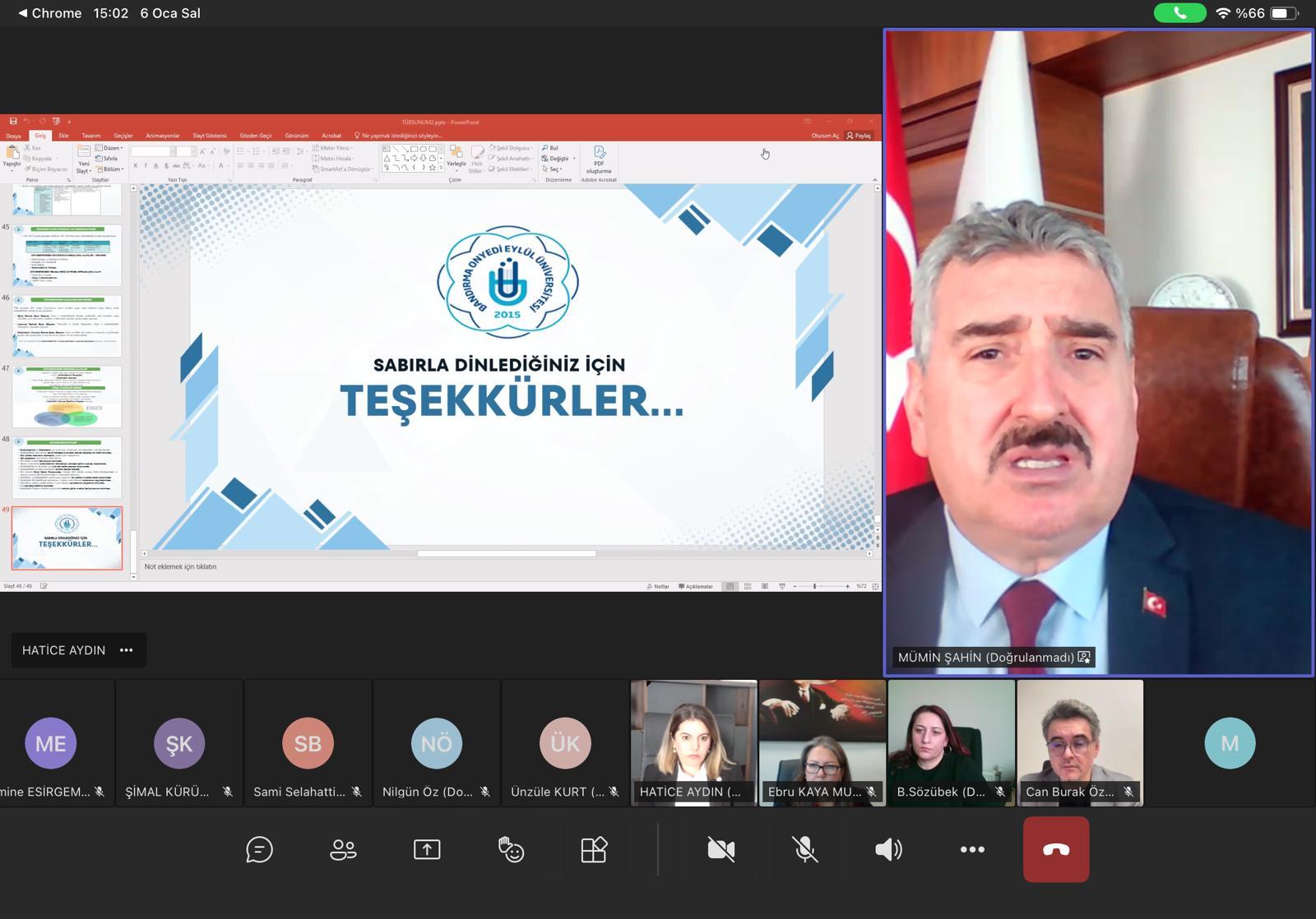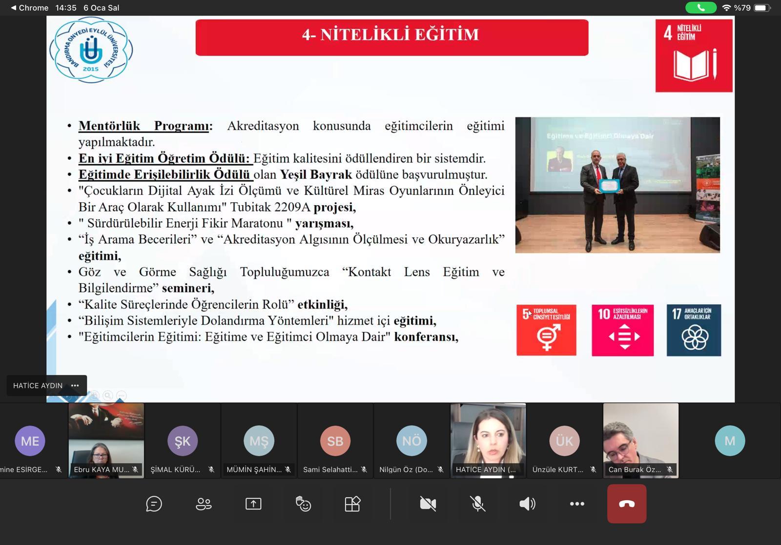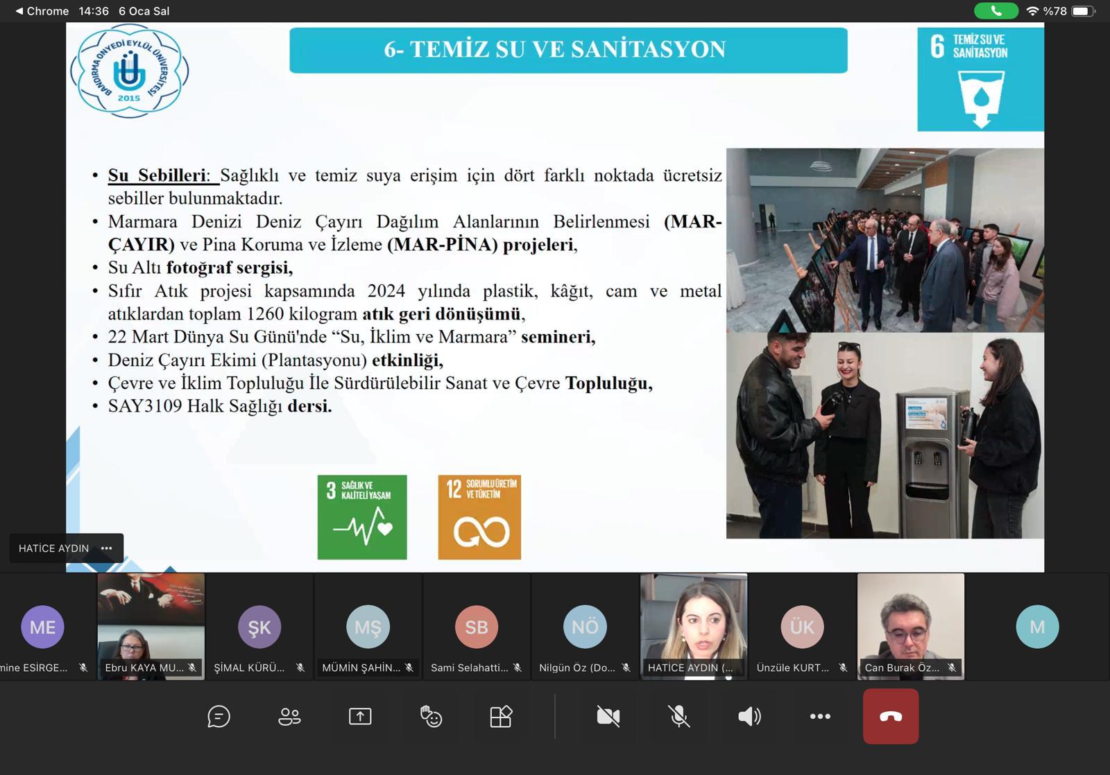 Sunumda, üniversitemizin misyon, vizyon ve temel değerlerinin sürdürülebilirlik ilkeleriyle uyumu, toplumsal etkisi yüksek, geleceği şekillendiren bireyler yetiştirme hedefi ve çözüm üreten üniversite anlayışı vurgulandı. Ayrıca üniversitemizin sürdürülebilirlik alanında elde ettiği başarılar ve sahip olduğu belgeler katılımcılarla paylaşıldı. Bu kapsamda; yenilenebilir enerji anlaşmaları, Turuncu Bayrak Ödülü, Dumansız Kampüs uygulamaları, Temiz Su, Temiz Gelecek çalışmaları ile Beslenme Dostu ve Fiziksel Aktiviteyi Destekleyen İş Yeri Sertifikası ve Sporu Kampüs Projesi kapsamında alınan ödüller hakkında bilgi verildi.