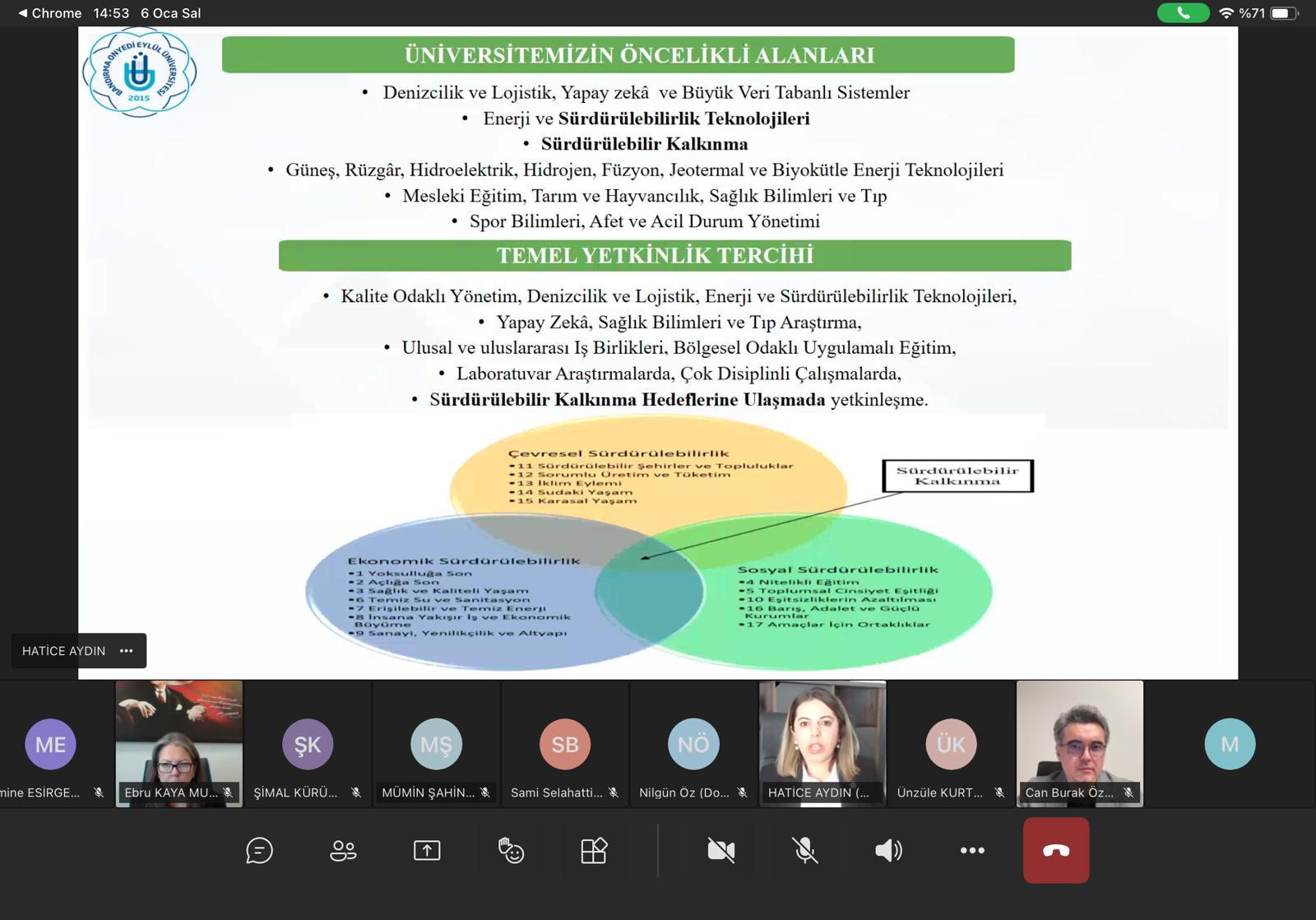 Toplantının konuşmacılığını Üniversitemiz Sürdürülebilir Kalkınma Amaçları Çalışma Grubu Başkanı ve İletişim Fakültesi Dekanı Prof. Dr. Hatice Aydın, moderatörlüğünü ise Doç. Dr. Can Burak Özkan üstlendi. Toplantıda, üniversitelerin sürdürülebilirlik odaklı vizyonları doğrultusunda yürüttükleri çevresel yönetim çalışmaları ve uygulama örnekleri ele alındı.