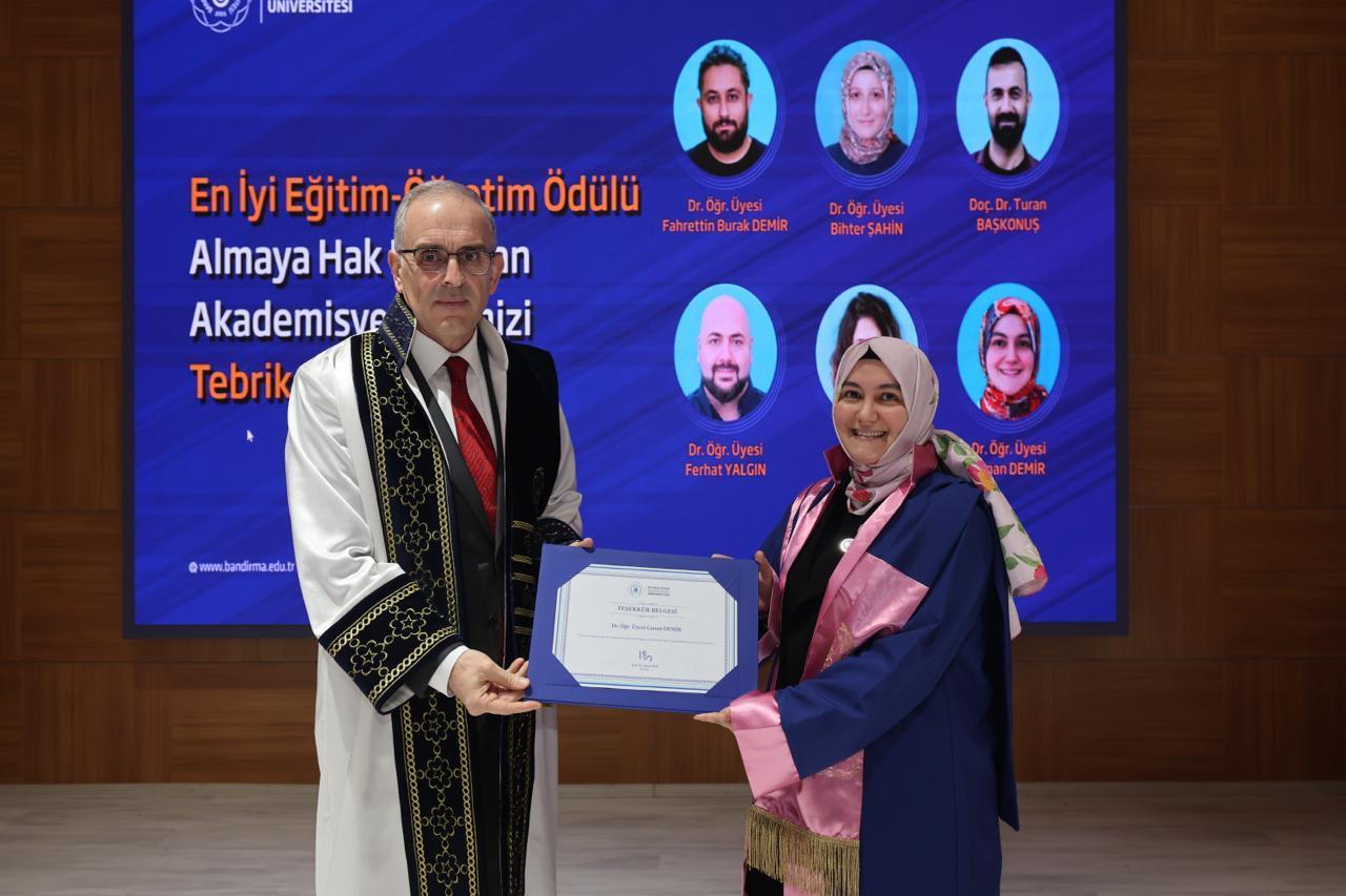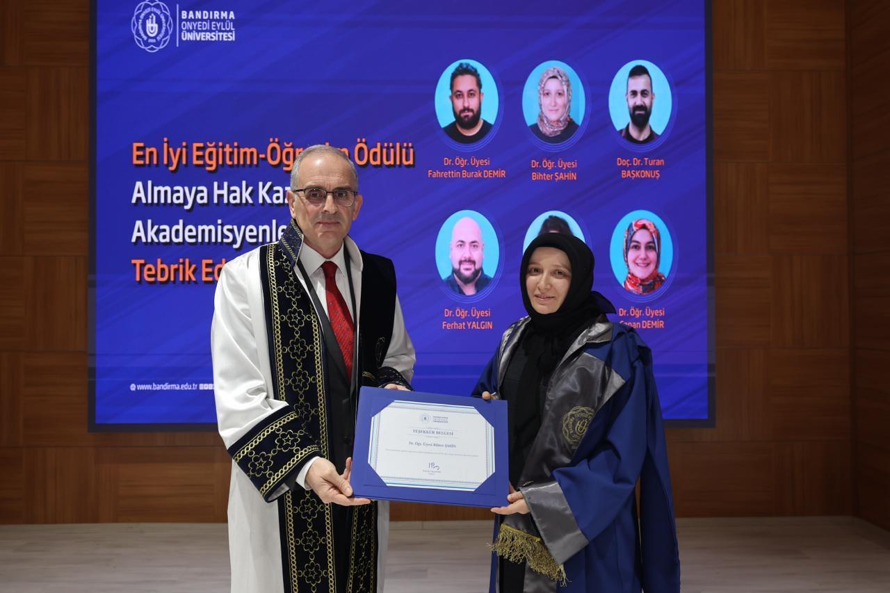 Bandırma Onyedi Eylül Üniversitesi bünyesinde, eğitim-öğretim faaliyetlerinde kaliteyi teşvik etmek ve akademik başarıyı desteklemek amacıyla yürütülen süreç kapsamında “En İyi Eğitim-Öğretim Ödülleri”ne layık görülen akademisyenlere teşekkür belgeleri takdim edildi.