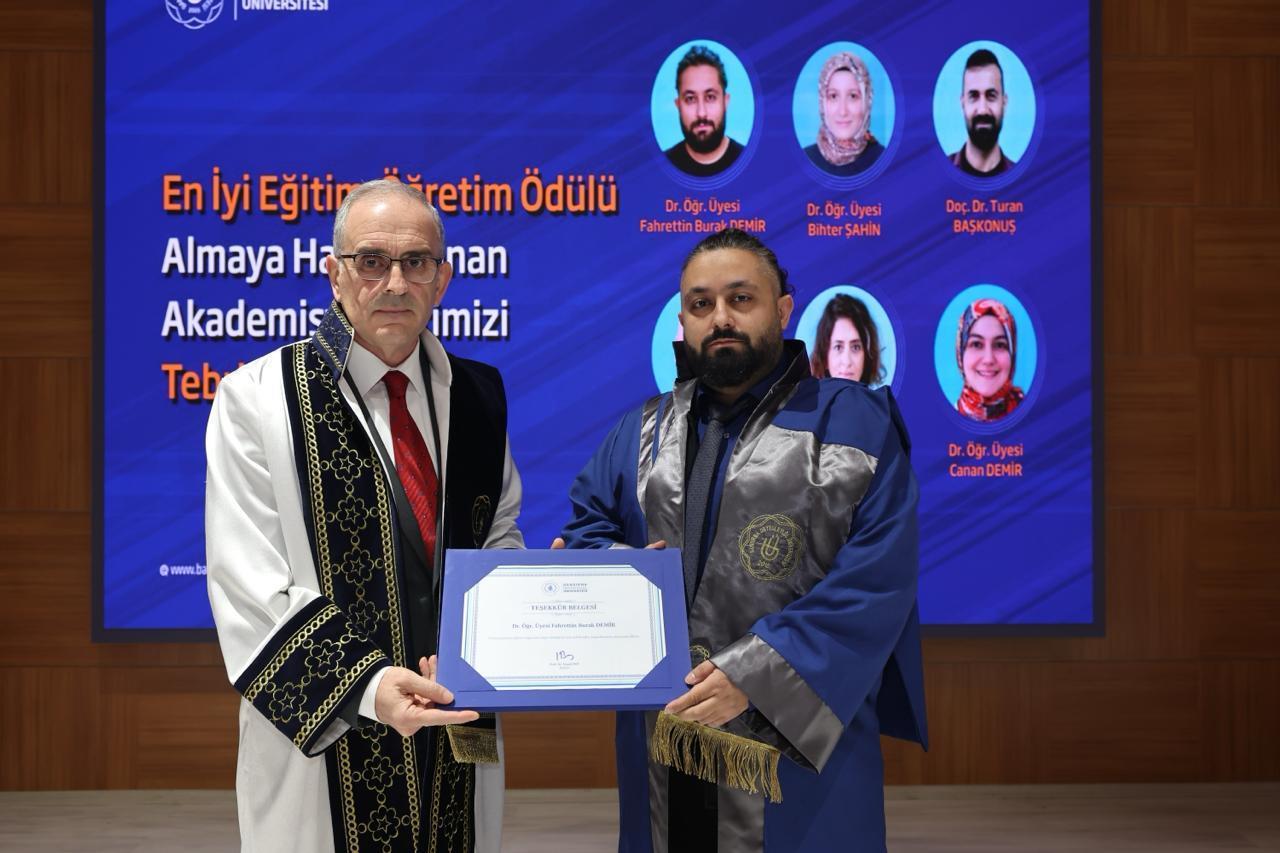 Üniversitemiz En İyi Eğitim-Öğretim Yönergesi doğrultusunda, Ödül Değerlendirme Komisyonu tarafından gerçekleştirilen değerlendirmeler sonucunda; Mühendislik ve Doğa Bilimleri Fakültesi’nden Dr. Öğr. Üyesi Fahrettin Burak Demir, Susurluk Tarım ve Orman Meslek Yüksekokulu’ndan Dr. Öğr. Üyesi Bihter Şahin, Spor Bilimleri Fakültesi’nden Doç. Dr. Turan Başkonuş, Denizcilik Meslek Yüksekokulu’ndan Dr. Öğr. Üyesi Ferhat Yalgın, Sağlık Hizmetleri Meslek Yüksekokulu’ndan Dr. Öğr. Üyesi Serpil Çolak ve Sağlık Bilimleri Fakültesi’nden Dr. Öğr. Üyesi Canan Demir ödüle layık görülmüş olup, kendilerine teşekkür belgeleri takdim edilmiştir.