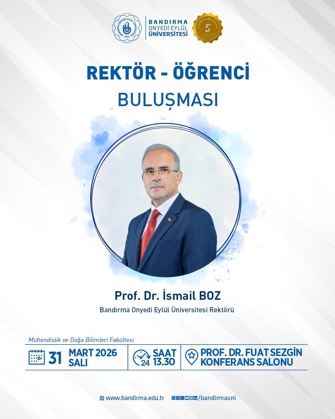 Rektörümüz Prof. Dr. İsmail Boz, “Rektör - Öğrenci Buluşması” programı kapsamında öğrencilerimiz ile bir araya gelecektir.